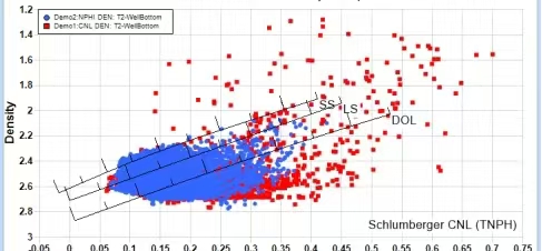 (1)環(huán)境校正:由于泥漿的浸泡、井壁坍塌及測(cè)井儀器故障和刻度誤差等造成曲線的測(cè)量不準(zhǔn)和畸變。如下圖通過中子-密度交匯方法確定存在異常的測(cè)井井段。藍(lán)色散點(diǎn)所示密度的范圍基本大于2.25,兩口井地層橫向連續(xù)性好,測(cè)井響應(yīng)會(huì)存在較好的橫向一致性,那么出現(xiàn)大量的低密度數(shù)據(jù)基本可以確定為異常值。