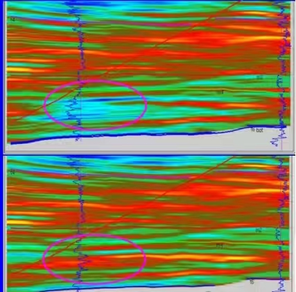 進(jìn)而會(huì)影響到地震反演,下圖中,擴(kuò)徑使得密度值降低,產(chǎn)生波阻抗異常低值段,在波阻抗反演剖面中擴(kuò)徑井段周圍產(chǎn)生低波阻抗區(qū)(下圖上),經(jīng)過校正后,與鄰井同一巖性段一致性變好(下圖下)。